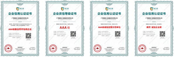 廣西冀桂川金屬結構有限公司始終恪守“誠實經營、質量保障、信譽至上、價格合理、合作共贏”的宗旨,嚴格按照ISO質量體系認證標準,為客戶提供系統的技術支持和施工建議,有效的為客戶解決難題,竭誠為客戶提供更優質滿意的工程。